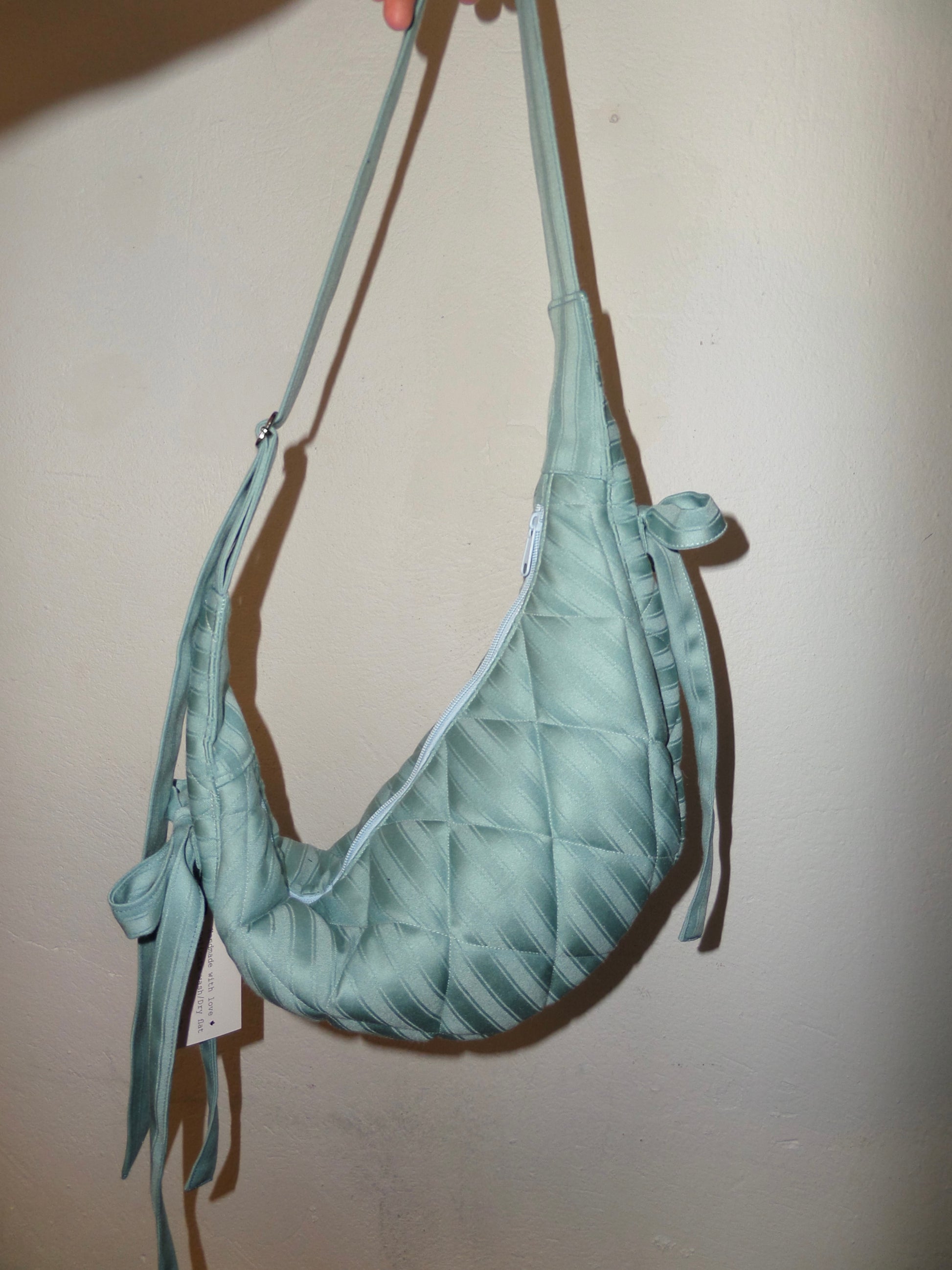 This bag is one of 3 others like it produced. Filled with interior pockets, and deceptively large, this is your perfect everyday bag that will have everyone asking you "wait... where did you get that?" Features include: removable bows and loop to clip on keys and accessories, adjustable strap to fit over bulky winter jackets, ludicrously capacious (fits an entire bottle of wine or emotional support water bottle as well as personal effects). All NIMMS bag are designed and handmade in Ontario by one single person (me! Nim!) and prioritize sustainability, function, and being the absolute cutest. All bags are one-of-one or one-of-a-few, never exceeding more than 10 of the same bag being produced.