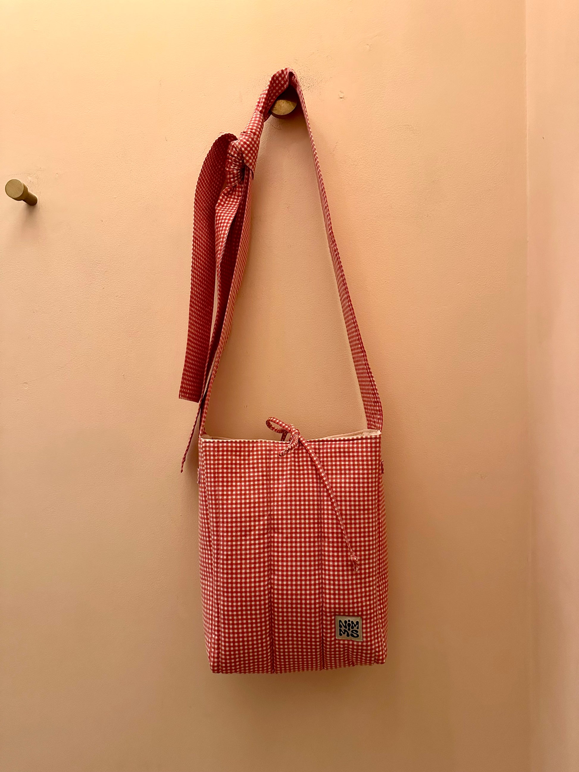 This bag is one of one produced. Wearing this bag may illicit unadulterated feelings of nostalgia and joy. Side effects may include a superiority complex when you get to tell everyone your bag is handmade and limited edition. Deceptively large, this is your perfect everyday bag that will have everyone asking you "wait... where did you get that?" Features include: exterior loops to clip on keys and accessories, adjustable strap to fit over bulky winter jackets, ludicrously capacious (fits an entire bottle of wine or emotional support water bottle as well as personal effects). All NIMMS bag are designed and handmade in Ontario by one single person (me! Nim!) and prioritize sustainability, function, and being the absolute cutest. All bags are one-of-one or one-of-a-few, never exceeding more than 10 of the same bag being produced.